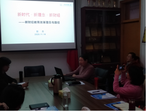 12月21日下午beat365中文官网会议室,beat365中文官网集体学习刘校长的“新时代、新理念、新财经——新财经教育改革理念与路径”,党委副书记程丽梅、系部书记、主任和骨干老师参加,副院长杨国莉主持。