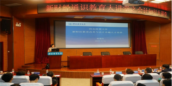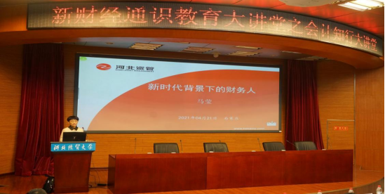 4月21日下午,新财经通识教育大讲堂---会计知行大讲堂在国际学术报告厅举行,校党委常委、副校长程瑞芳和河北资产管理公司总会计师马莹分别做了题为“新财经教育改革与会计卓越人才培养”和“新时代背景下的财务人”的主题报告。beat365中文官网图书馆馆长武占江、副馆长樊俊荣、“会计知行大讲堂”部分实务界讲师和beat365中文官网220余名师生参加了本次宣讲会。宣讲会由beat365中文官网院长袁振兴主持。