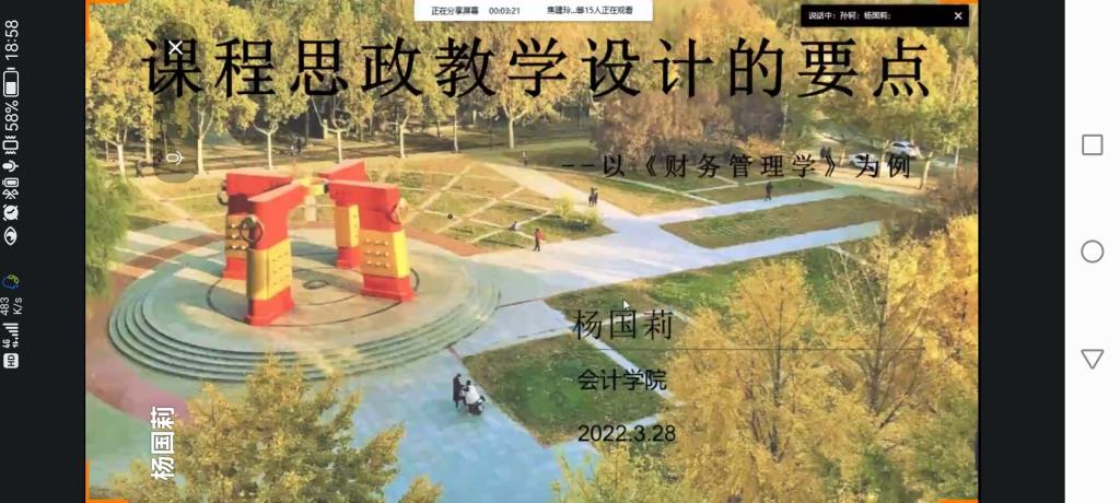 2022年3月28日晚上,由教学评估与教师教学发展中心主办,beat365中文官网承办的本学期第一期教学沙龙活动在线上顺利开展。beat365中文官网杨国莉教授主讲的教学沙龙主题是“课程思政教学设计的要点---以《财务管理学》为例”。beat365中文官网、商学院、数统学院的50多名教师参加了本次活动。