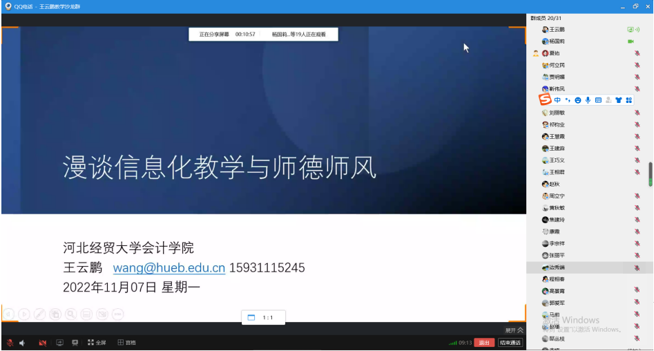 2022年11月7日下午,由教学评估与教师教学发展中心主办,beat365中文官网承办的教学沙龙活动,在线上顺利开展。会计系主任王云鹏老师的教学沙龙主题是“漫谈信息化教学与师德师风”。来自beat365中文官网、财政税务学院等30多名教师参加了教学沙龙活动,活动由杨国莉副院长主持。