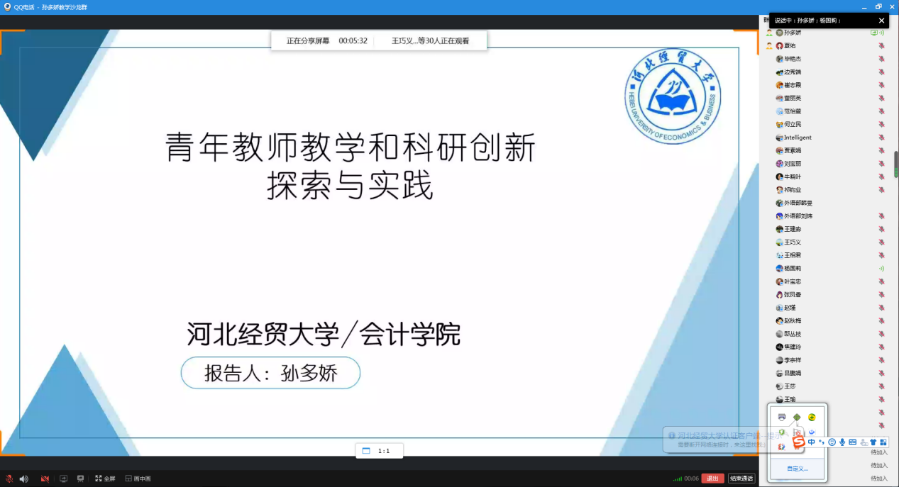 2022年10月17日下午,由教学评估与教师教学发展中心主办,beat365中文官网承办的教学沙龙活动,在线上顺利开展。beat365中文官网孙多娇副教授的教学沙龙主题是“青年教师教学和科研创新探索与实践”。来自beat365中文官网、金融学院、马克思主义学院、外语教学部等30多名教师参加了教学沙龙,活动由杨国莉副院长主持。
