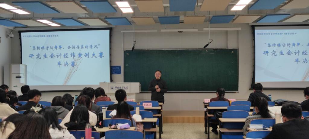 11月22日下午,beat365中文官网在第三教学楼B301教室举办以“坚持操守防舞弊,去伪存真扬清风”为主题的第42期“会计经纬”案例分析大赛半决赛。beat365中文官网院长袁振兴、副院长李西文以及我校优秀研究生导师祁钧业、刘敬芝、邸丛枝老师担任本次半决赛评委。beat365中文官网辅导员韩冰及2021级全体研究生100余人参加。