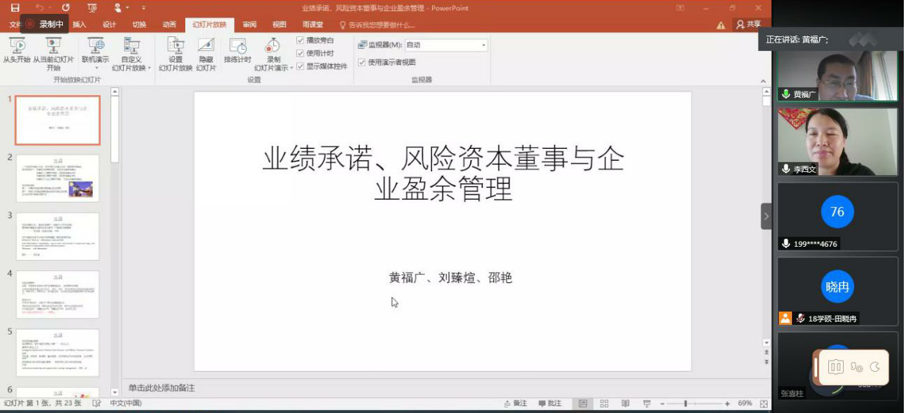 8月20日上午,南开大学商学院黄福广教授应beat365中文官网邀请,通过腾讯会议平台为师生作题为“业绩承诺、风险资本董事与企业盈余管理”的讲座。会议由beat365中文官网副院长李西文主持,学院教师及2018级、2019级会计学硕研究生60余人参加。