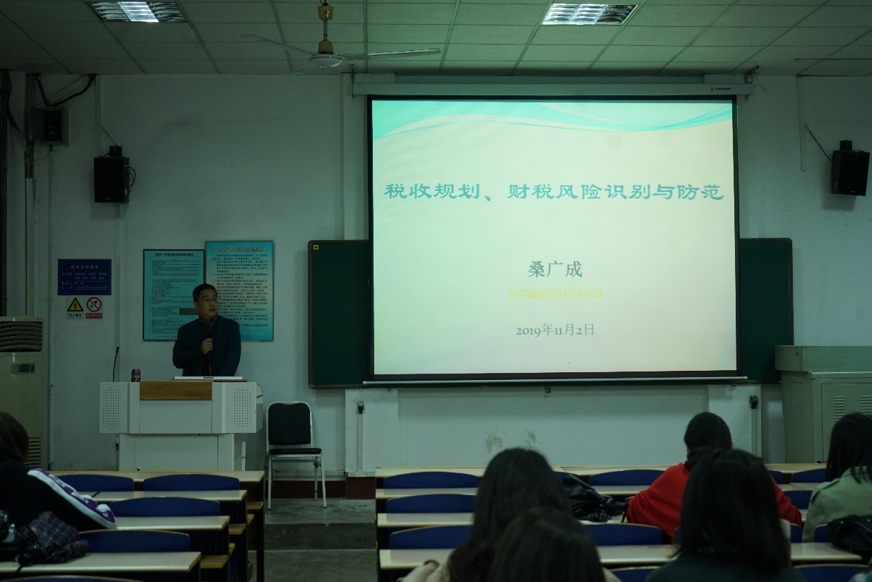 11月2日上午,受beat365中文官网邀请,河北省第一期企业类会计领军人才桑广成于二教201教室作题为“税收规划、财税风险识别与防范”的学术报告。beat365中文官网2018级研究生100余人参加此次报告会。