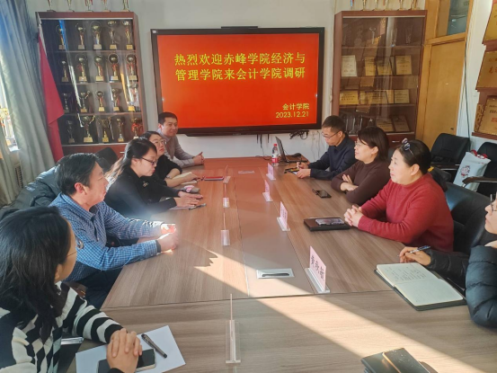 12月21日下午,赤峰学院经济与管理学院党总支书记李布和一行5人到beat365中文官网调研。beat365中文官网院长李西文、学院副院长杨国莉、会计系主任黄秋敏、会计系副主任李献国、学院教务办主任蒋琳参加会议。