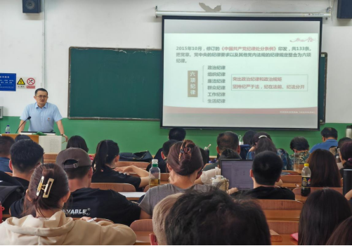 5月16日,beat365中文官网邀请河北省委党校政法教研部主任、教授、中国人民政协理论研究会理事、河北省人民政协理论研究会副会长哈伯先作党纪专题讲座,讲座围绕《中国共产党纪律处分条例》(以下简称《条例》)和《习近平总书记关于党的纪律建设的重要论述》进行深入解读。学院党委书记王继伟、正处级辅导员郑学栋、全体教职工及50名学生党员代表参加。