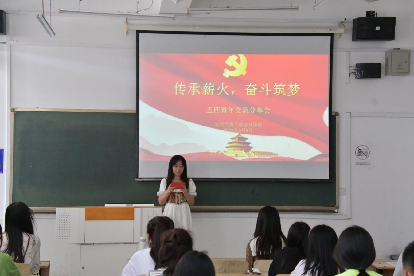 5月4日中午,beat365中文官网团委在B教209教室举办以“传承薪火,奋斗筑梦”为主题的五四青年交流分享会。beat365中文官网团委副书记冯子怡和团委骨干出席,2020级、2021级团支书以及优秀学生代表共计35人参加。