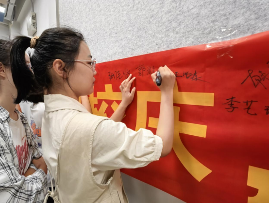 优秀学生代表在宣传条幅上签字