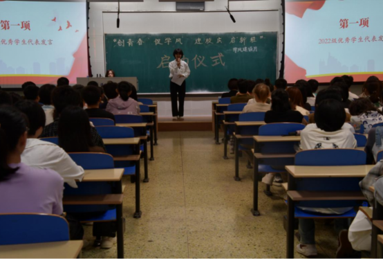 大会第一项,由2022级优秀学生代表倪嘉域同学上台发言。首先,倪嘉域向同学们强调了学风建设的重要性。随后,她根据自身学习经历就树立端正的学习态度、制定合理的学习计划与同学们展开交流,呼吁大家要积极参加课堂学术活动,拓宽自身学术视野,了解最新学术动态,走出舒适圈,拓展交际面,以合作共谋发展,用奋斗描绘青春。