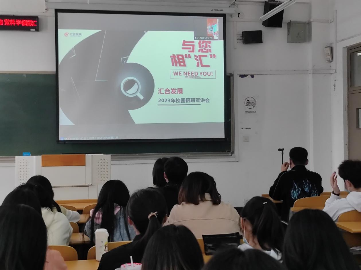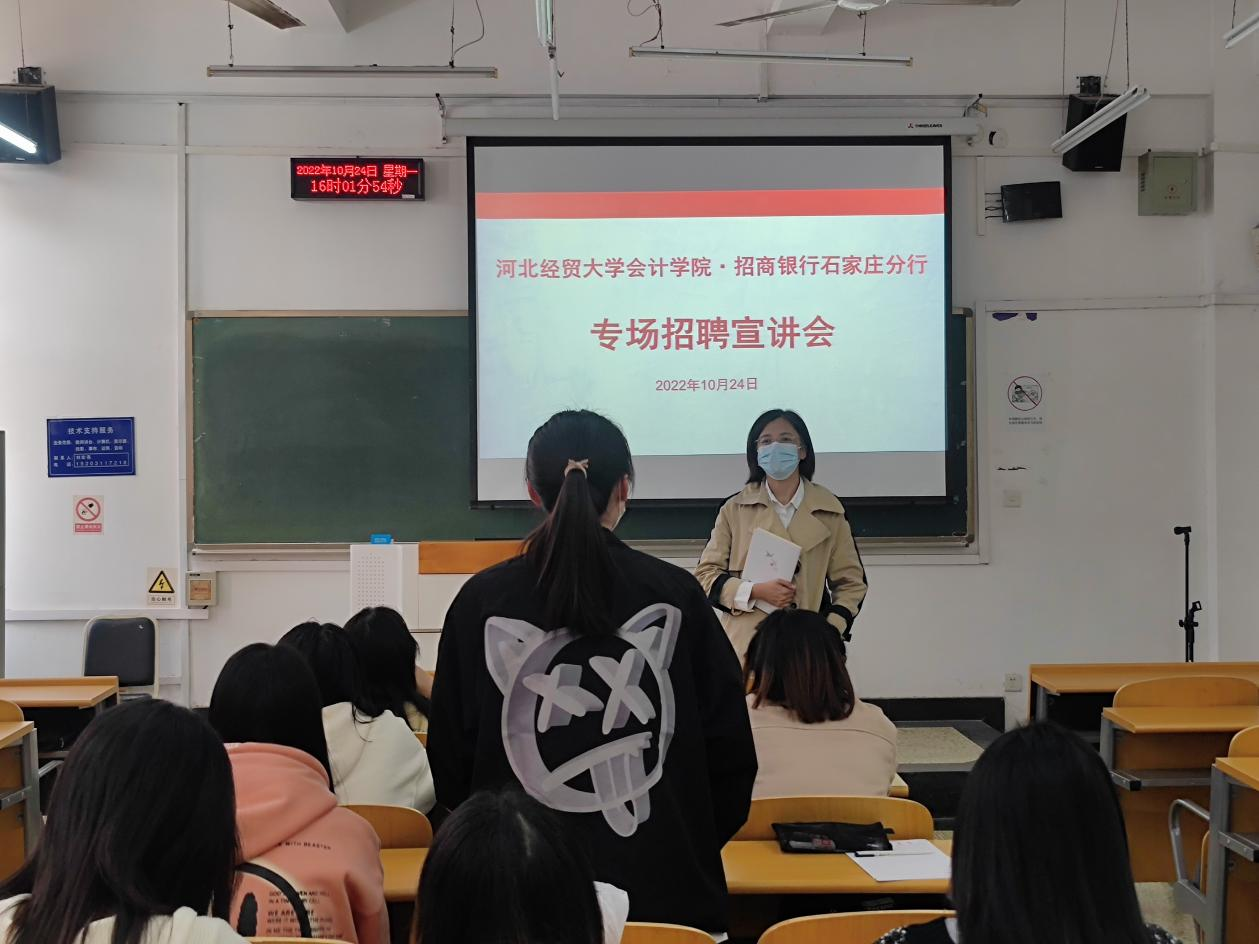 10月24日下午3点,beat365中文官网在北三教B110举办招商银行石家庄分行专场招聘宣讲会,宣讲会线上线下同时进行,学院党委副书记程丽梅、就业联络员付磊和近百名同学参加了此次招聘会。
