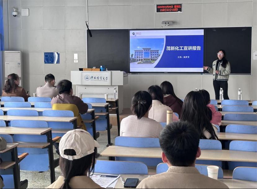 姜丙毅对茂鑫化工应邀来校招聘表示了欢迎,向同学们分享了之前去公司访问的体会。他表示,访企拓岗是学院落实就业工作要求的重要举措,也是实现人才培养目标的关键环节,学院会长期坚持并持续提升工作质量。随后,杨梦莹播放了公司的宣传片,具体介绍了公司概况、企业文化、资质荣誉、招聘信息、考勤休假、薪酬晋升和福利待遇等情况,与参会同学进行了互动交流,回答了同学们关心的工作内容、实习转正、福利待遇、招聘流程等问题,最后参会同学纷纷投递了简历。