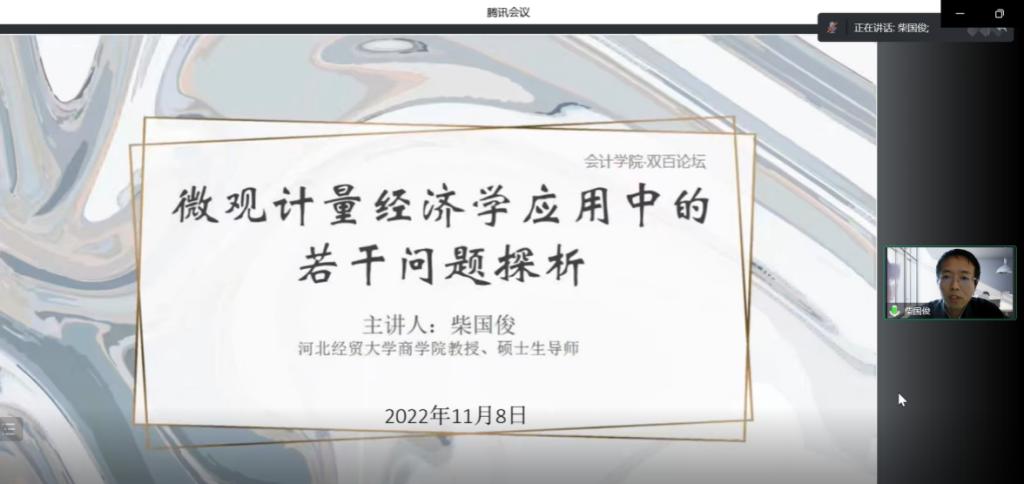 2022年11月8日上午,柴国俊教授应beat365中文官网邀请,通过腾讯会议平台为同学们作题为《围观计量经济学应用中的若干问题探析》的报告。beat365中文官网副院长李西文、科研秘书韩冰及全体研究生参加本次学术报告。