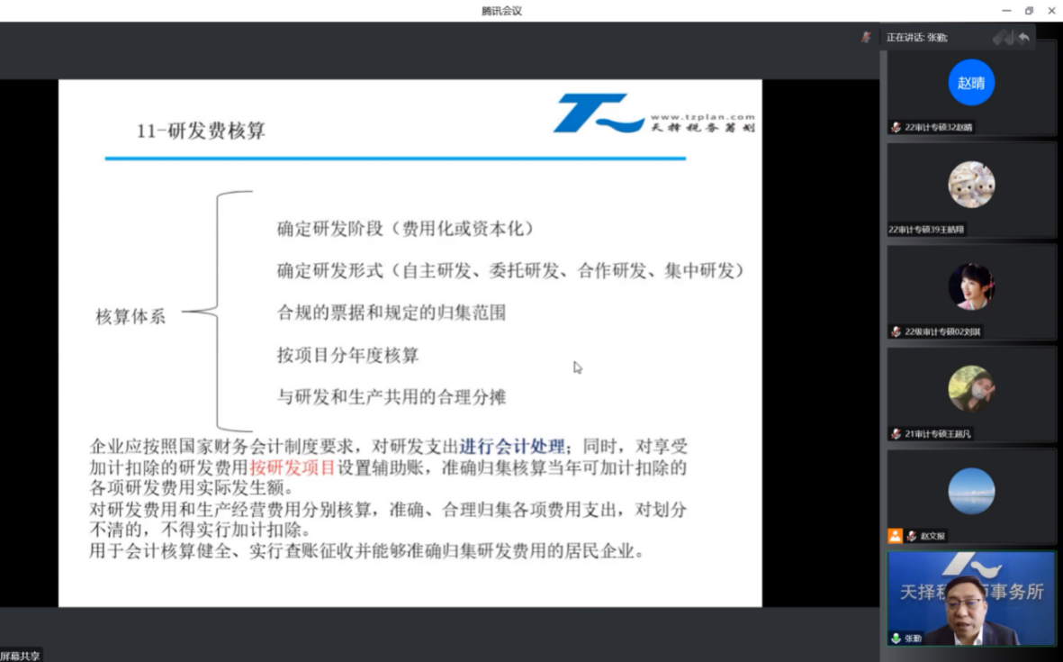 2022年10月7日上午,天择税务师事务所河北分所总经理张勤应beat365中文官网邀请,通过腾讯会议为师生们做题为《研发费用加计扣除理论与实操问题探究》的主题报告。党委书记赵文报主持此次讲座,科研秘书韩冰、部分导师以及21级、22级beat365中文官网全体研究生参加本次讲座。