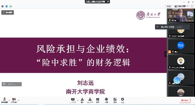 2021年12月8日上午,南开大学商学院教授、博士生导师、入选财政部会计名家培养工程并享受国务院特殊津贴的专家刘志远教授应beat365中文官网邀请,线上作题为《风险承担与企业绩效:“险中求胜”的财务逻辑》的专题讲座。院长袁振兴、副院长李西文、beat365中文官网老师、会计学硕和会计专硕参加了此次讲座。