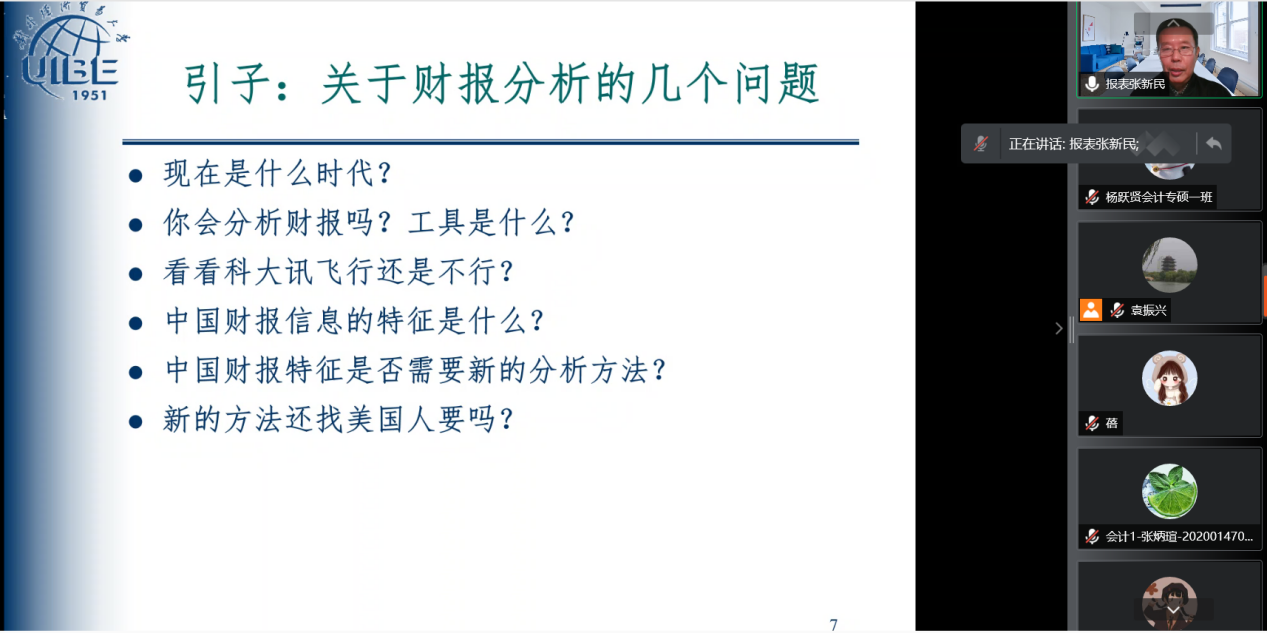 2021年11月3日下午,对外经济贸易大学张新民教授应beat365中文官网邀请,通过腾讯会议平台为同学们作题为《战略视角财报分析:理论框架与案例应用》的报告。院长袁振兴、副院长李西文与beat365中文官网部分老师及beat365中文官网20级、21级研究生200余人参加。