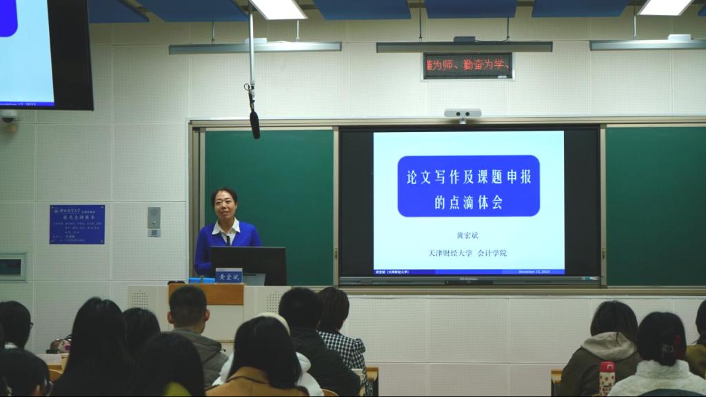 黄教授主持国家自然科学基金面上项目1项,主持并完成国家自然科学基金青年项目1项,中国博士后科学基金特别资助项目1项,中国博士后科学基金面上一等资助项目1项,主持并完成天津社会科学规划项目1项,天津市财政局重点会计科研项目2项,其丰富的课题撰写与申报经验使得本次报告精彩纷呈、亮点频现。